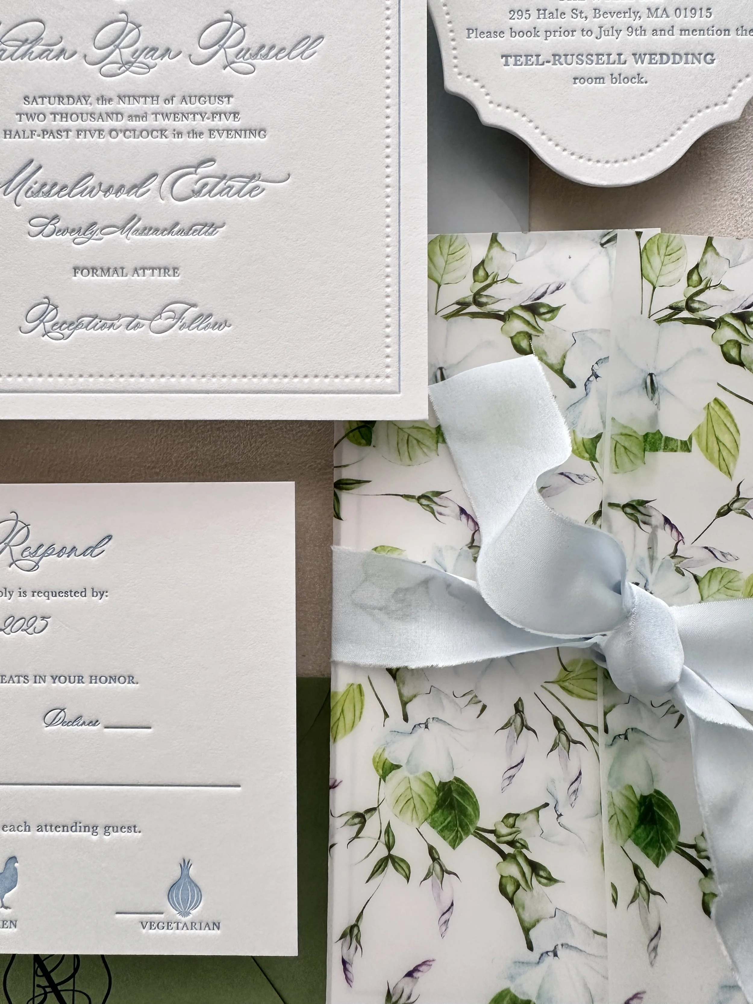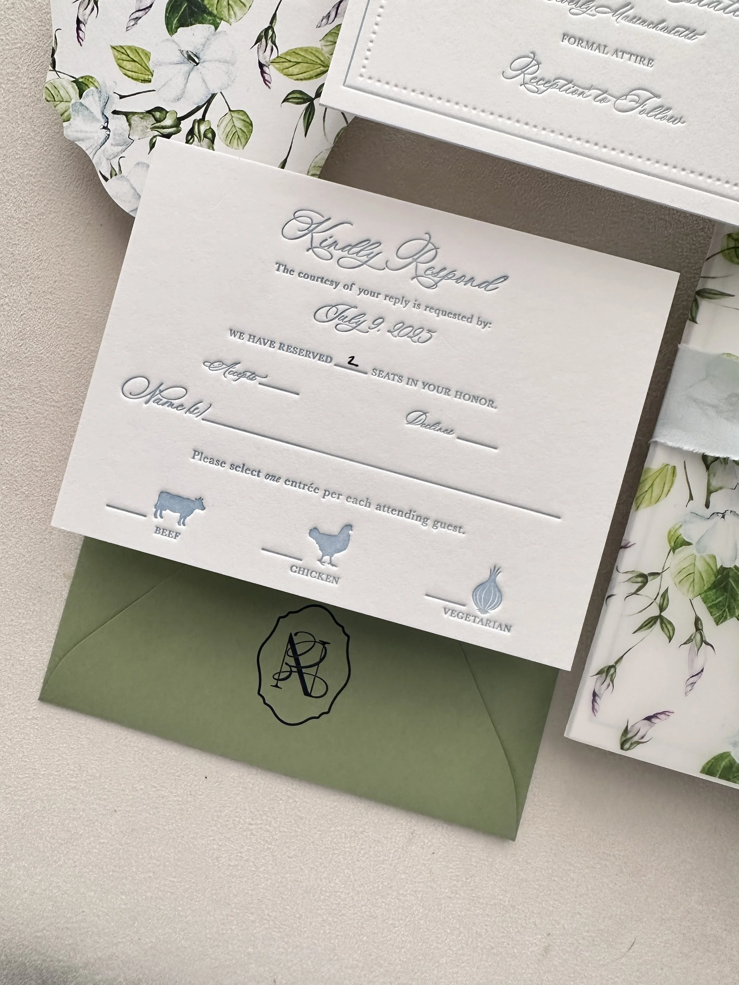 Bring timeless elegance and artisan craftsmanship to your celebration with this Semi-Custom Wedding Suite — thoughtfully designed for couples who value design and ease. Each suite includes up to five expertly crafted pieces, showcasing our signature letterpress printing on luxuriously thick cotton paper.