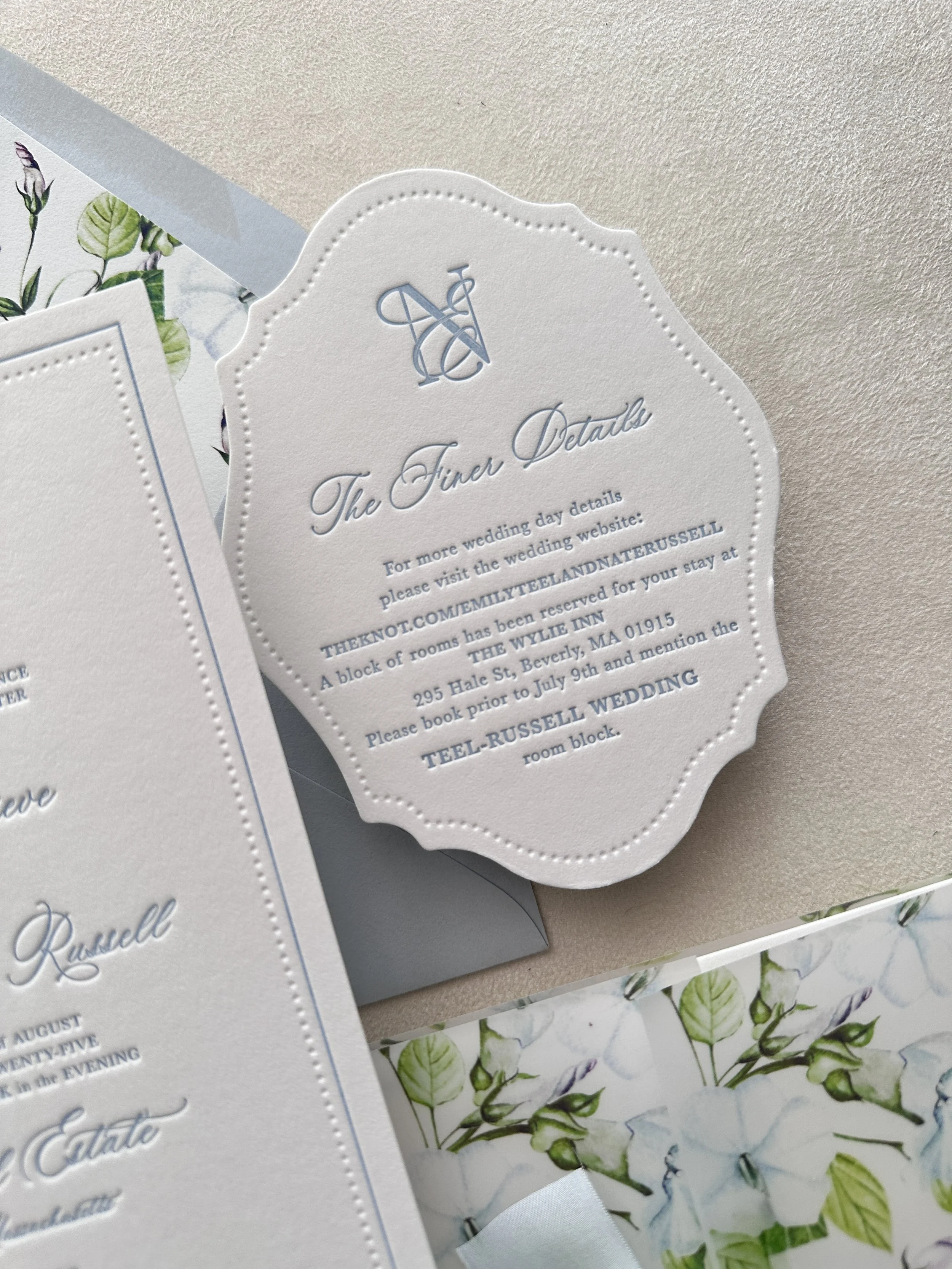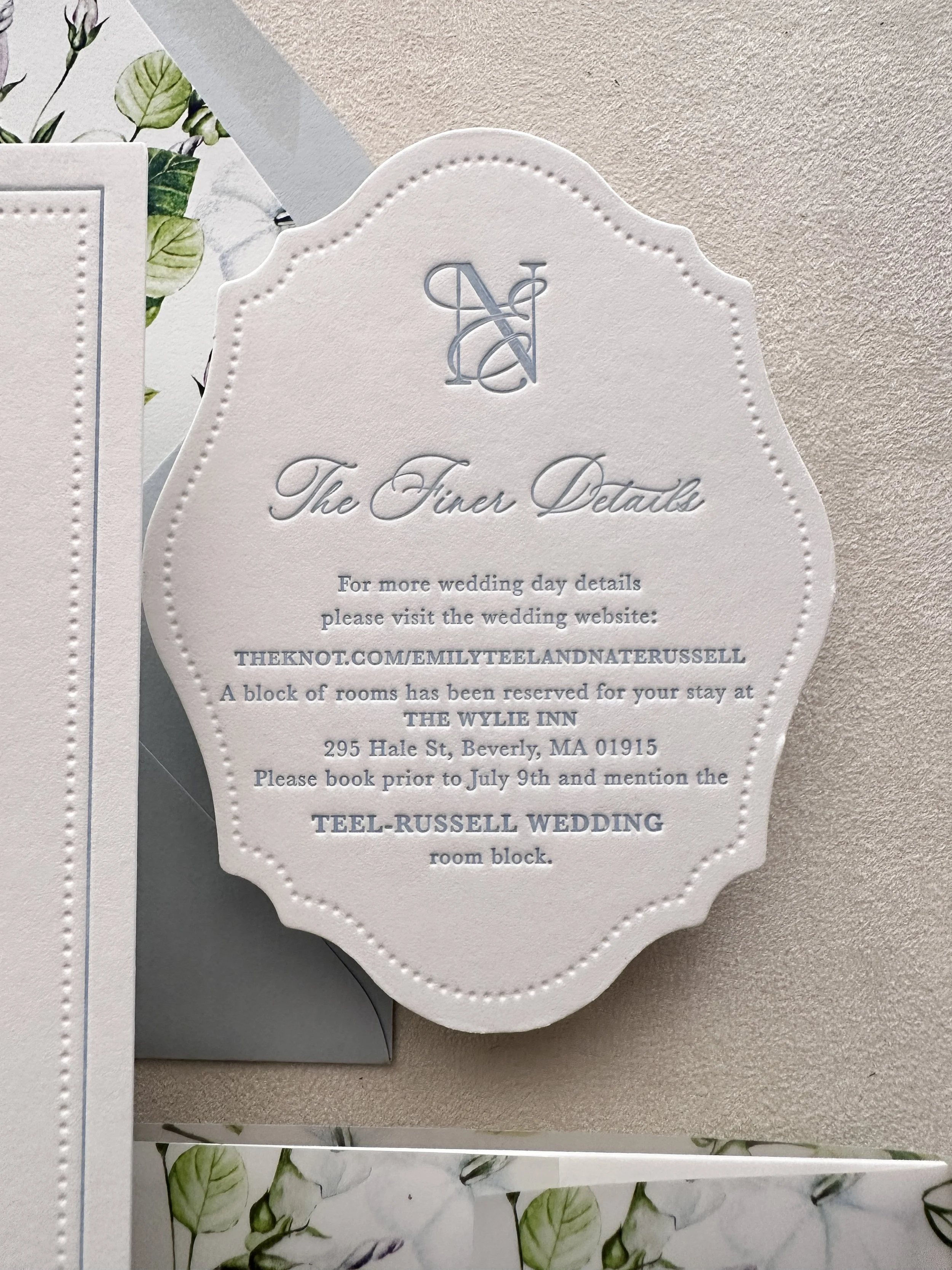Perfect for sharing weekend events, accommodations, website links, or registry details. Printed on your selected paper with the same luxurious press finish. Like the RSVP, this card may be tailored to collect digital responses or mailed inquiries.