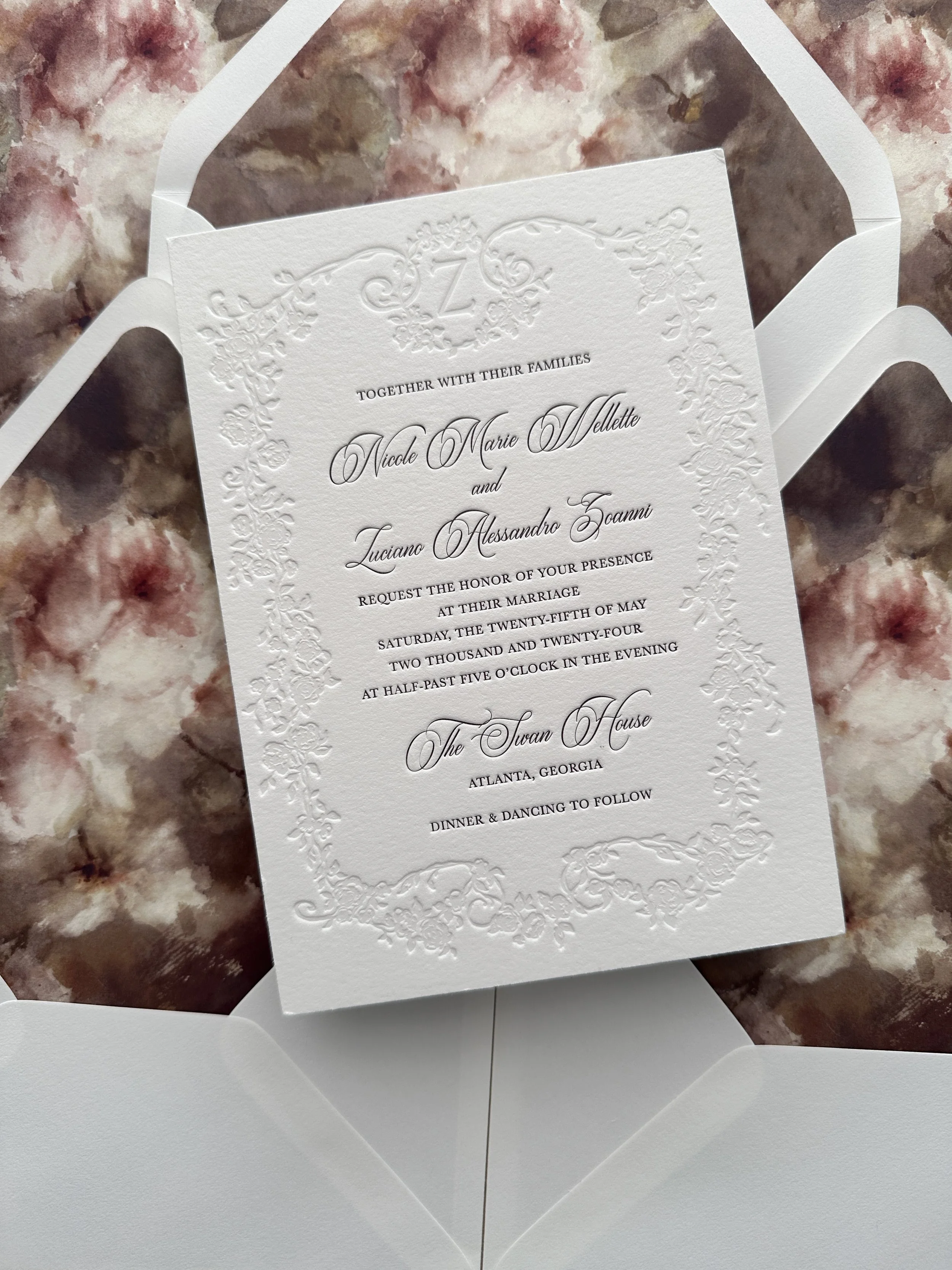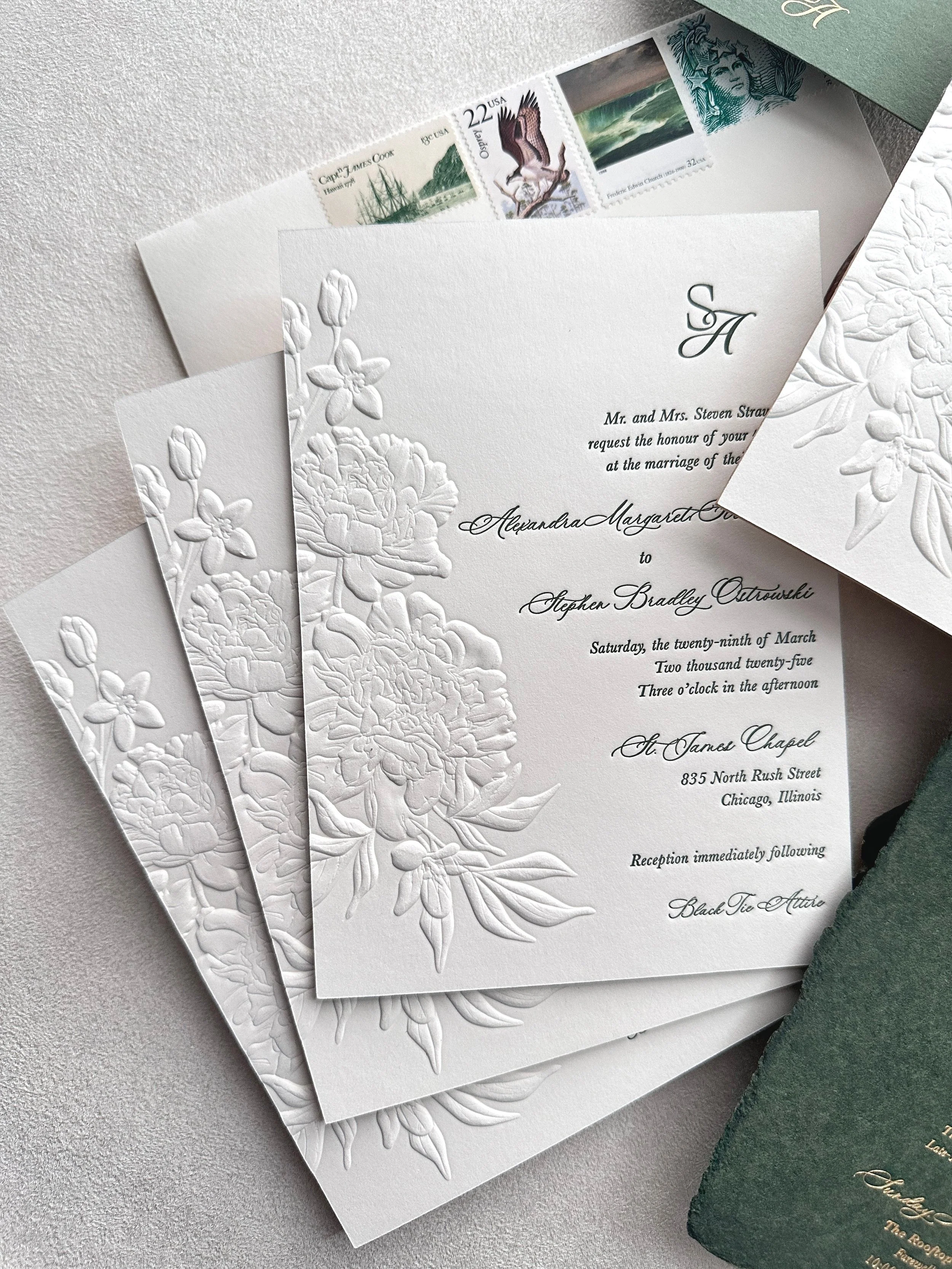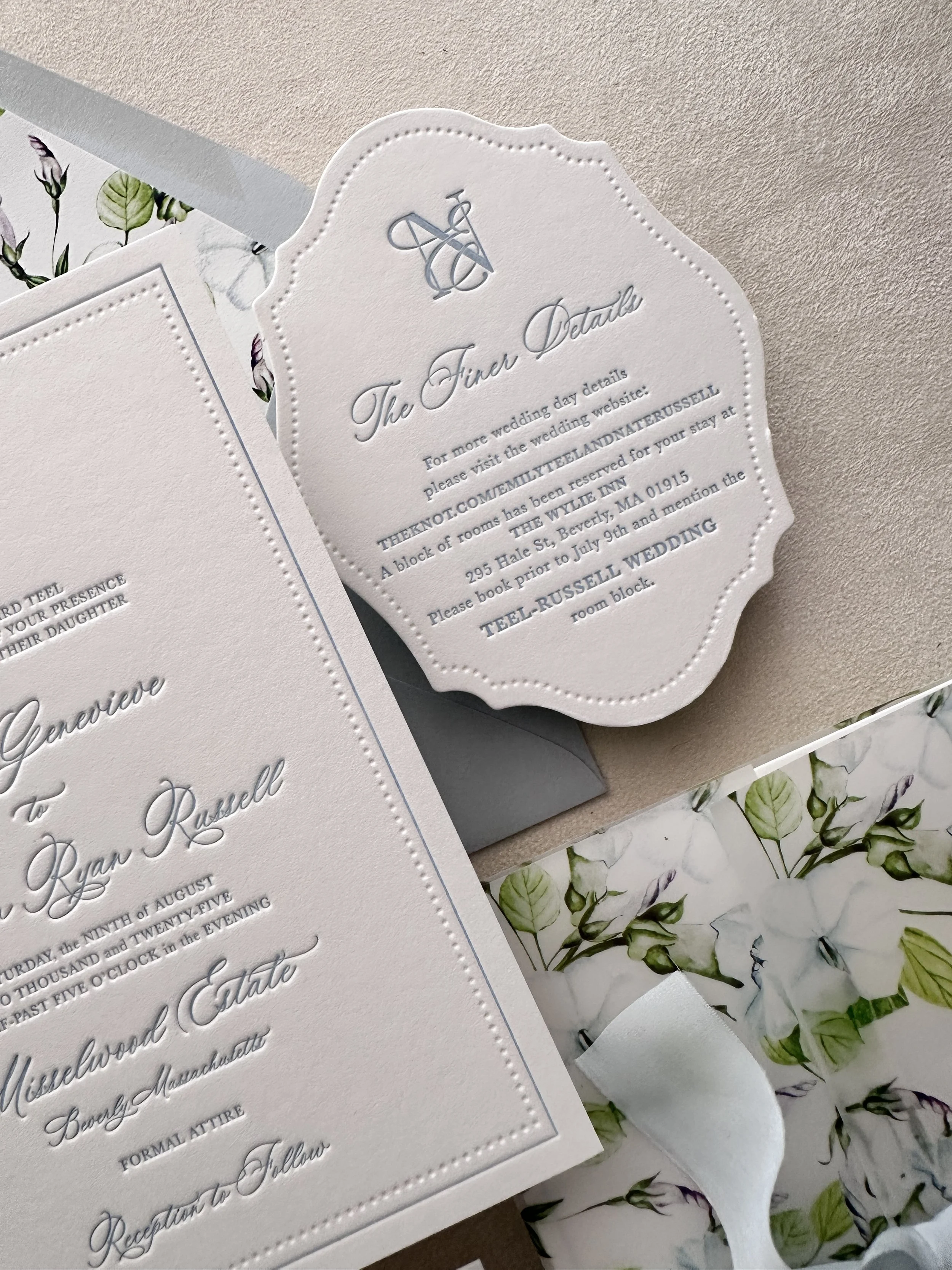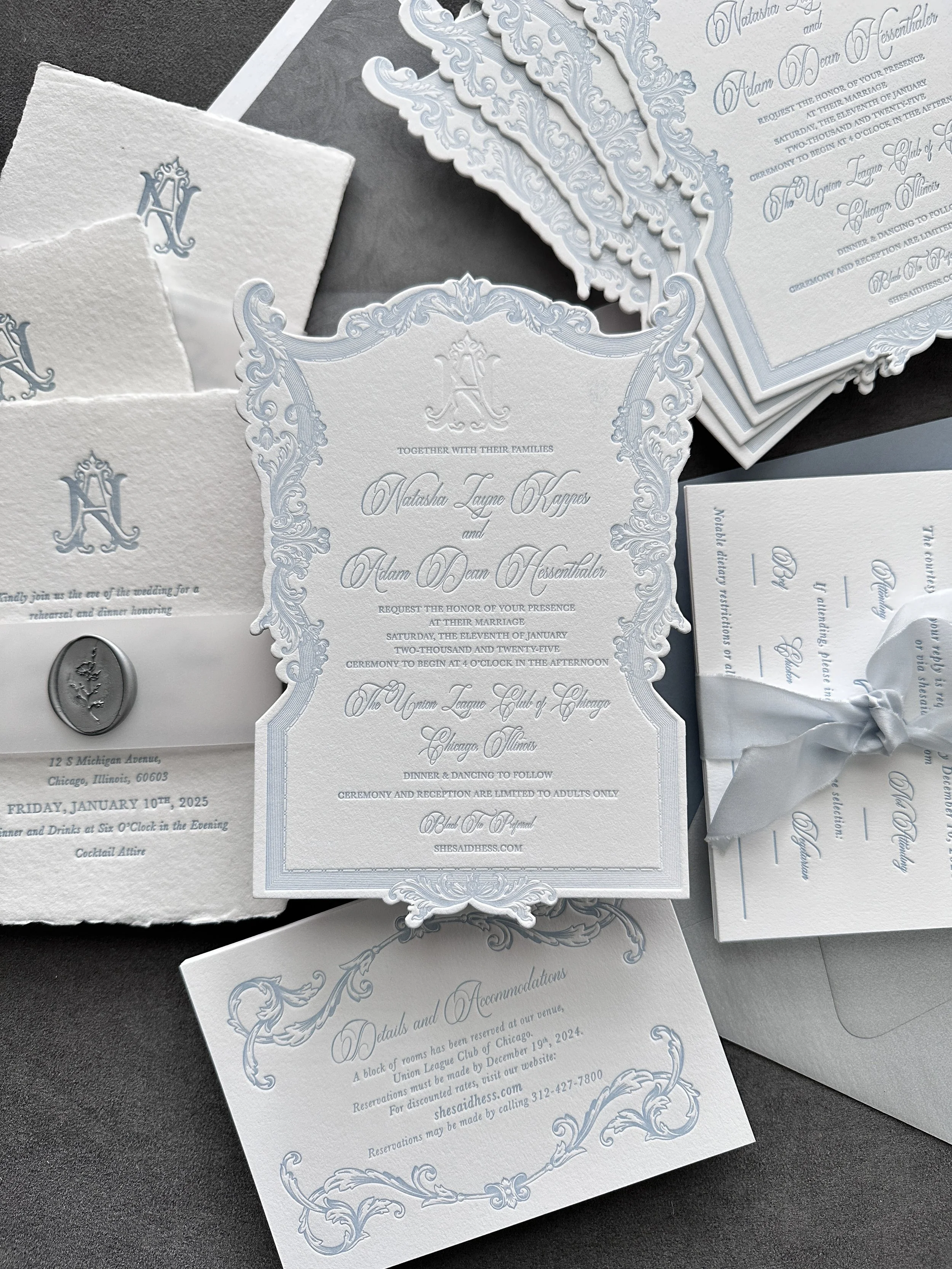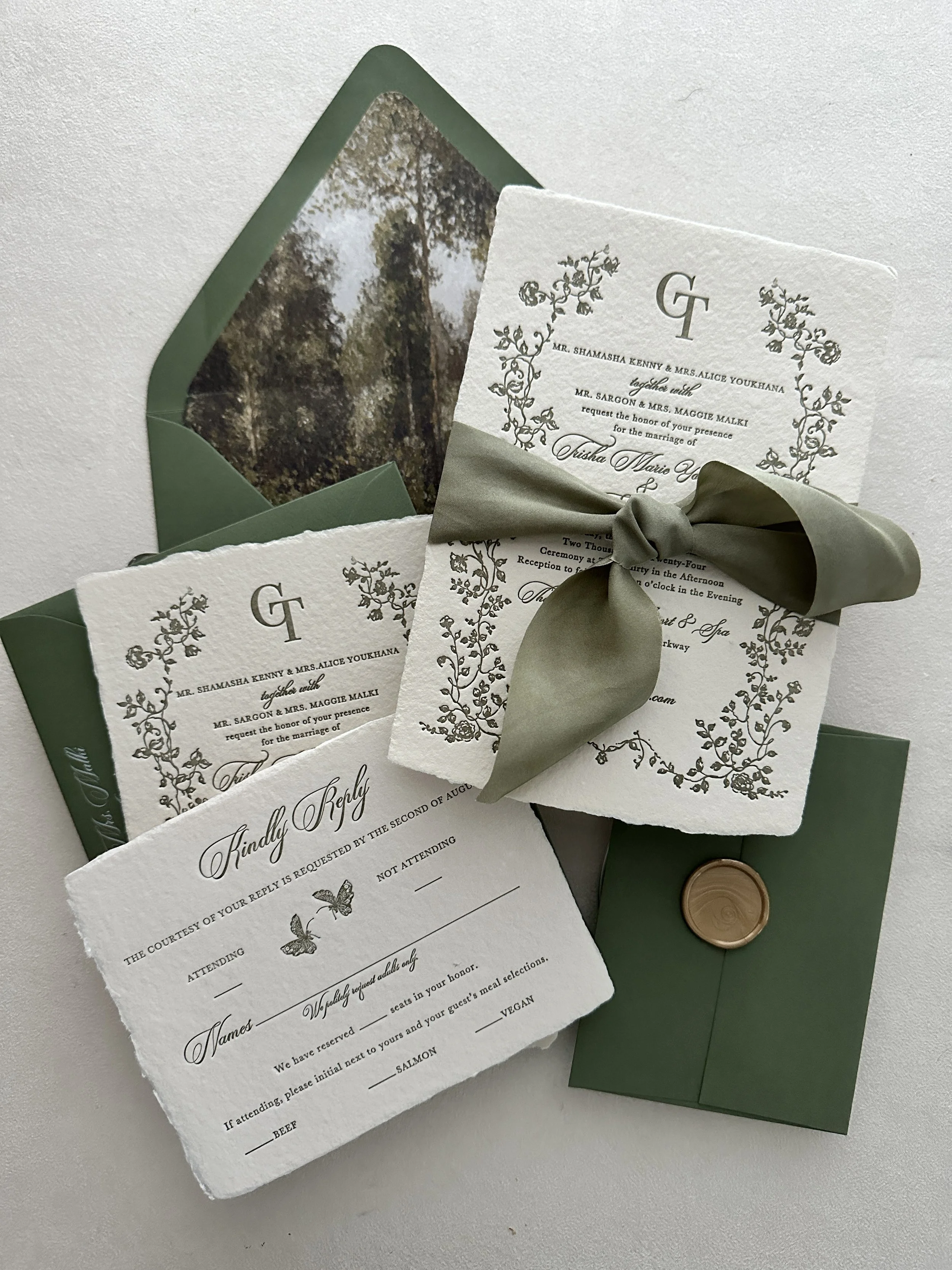 Your choice of one premium embellishment: wax seal, silk ribbon, vellum wrap, or envelope liner