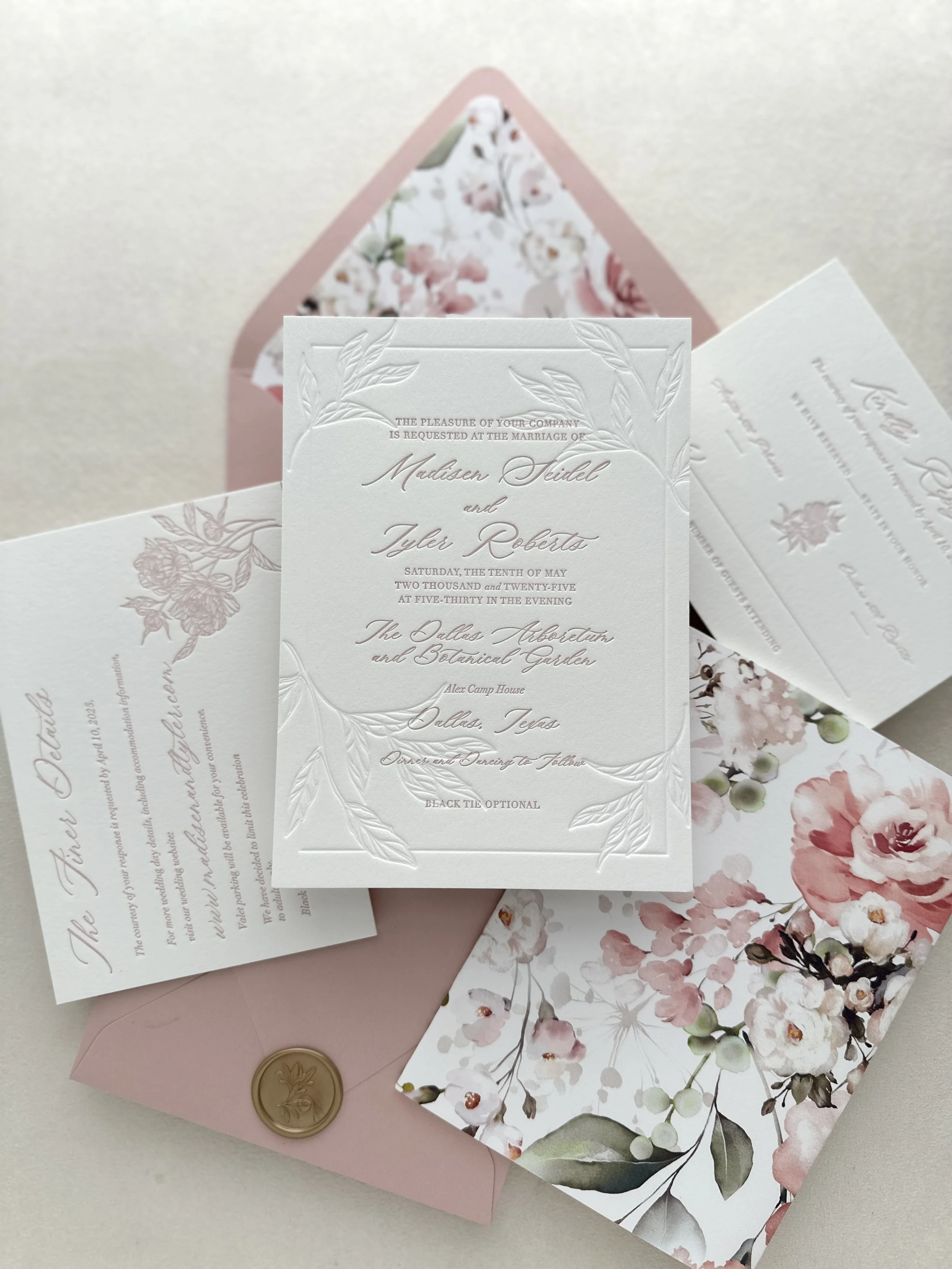 • Letterpress printed on cotton or handmade paper in soft white, blush, or natural tones